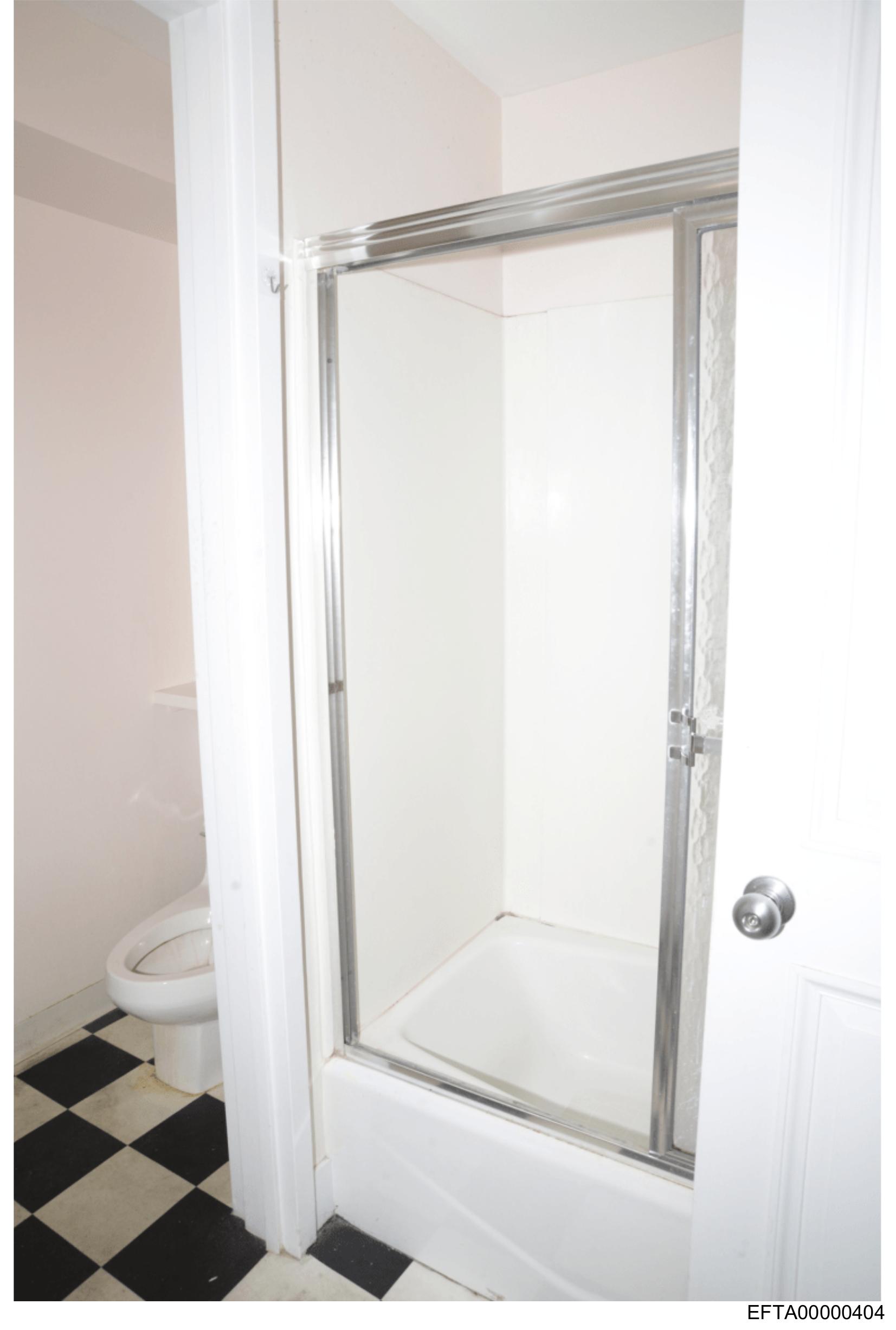The image shows an interior view of a bathroom with a distinctive feature: the toilet is placed directly next to the shower stall.
