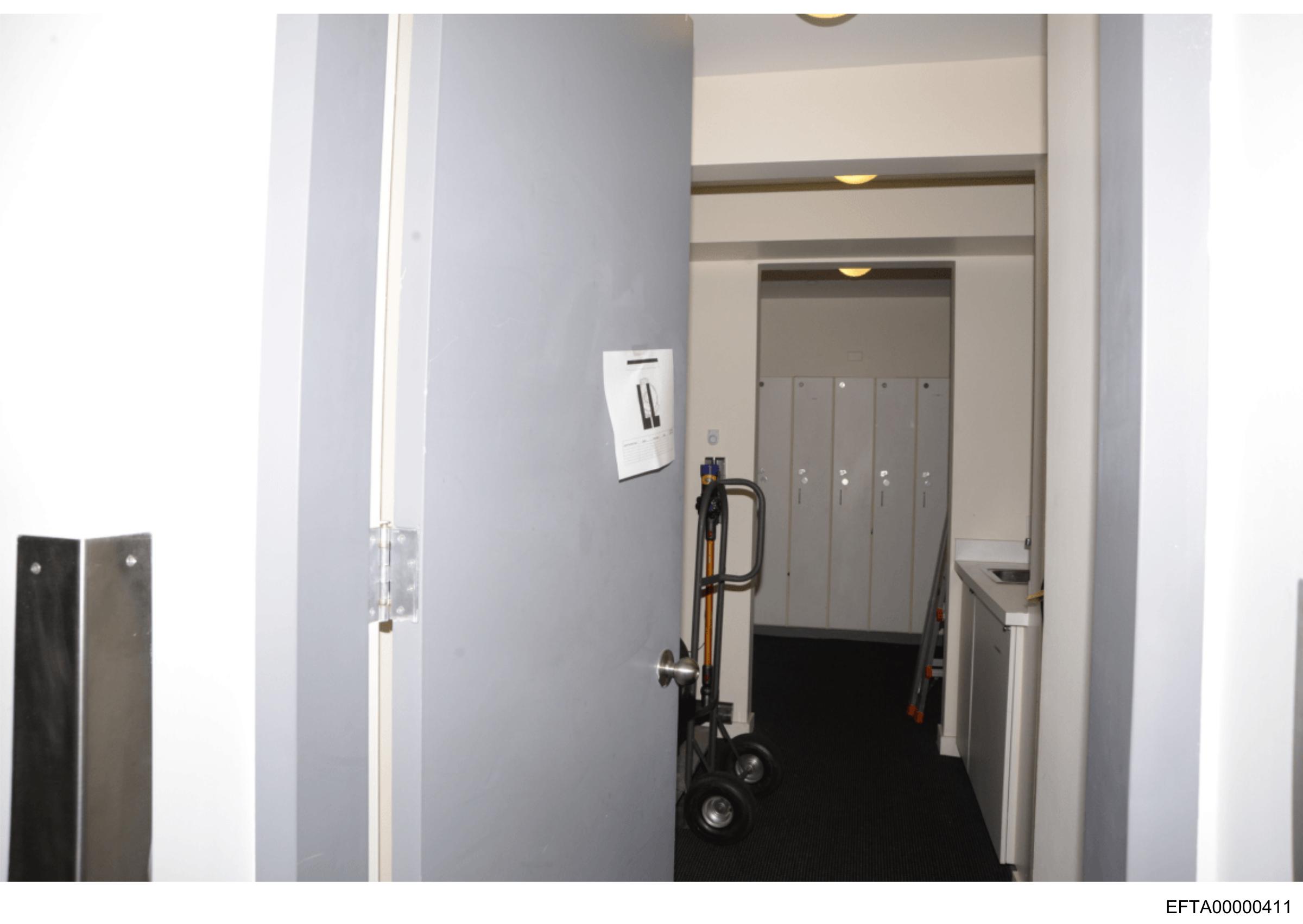 This is a photograph of an interior space that appears to be a room with doors on either side, suggesting it could be a corridor leading to restrooms or similar facilities.