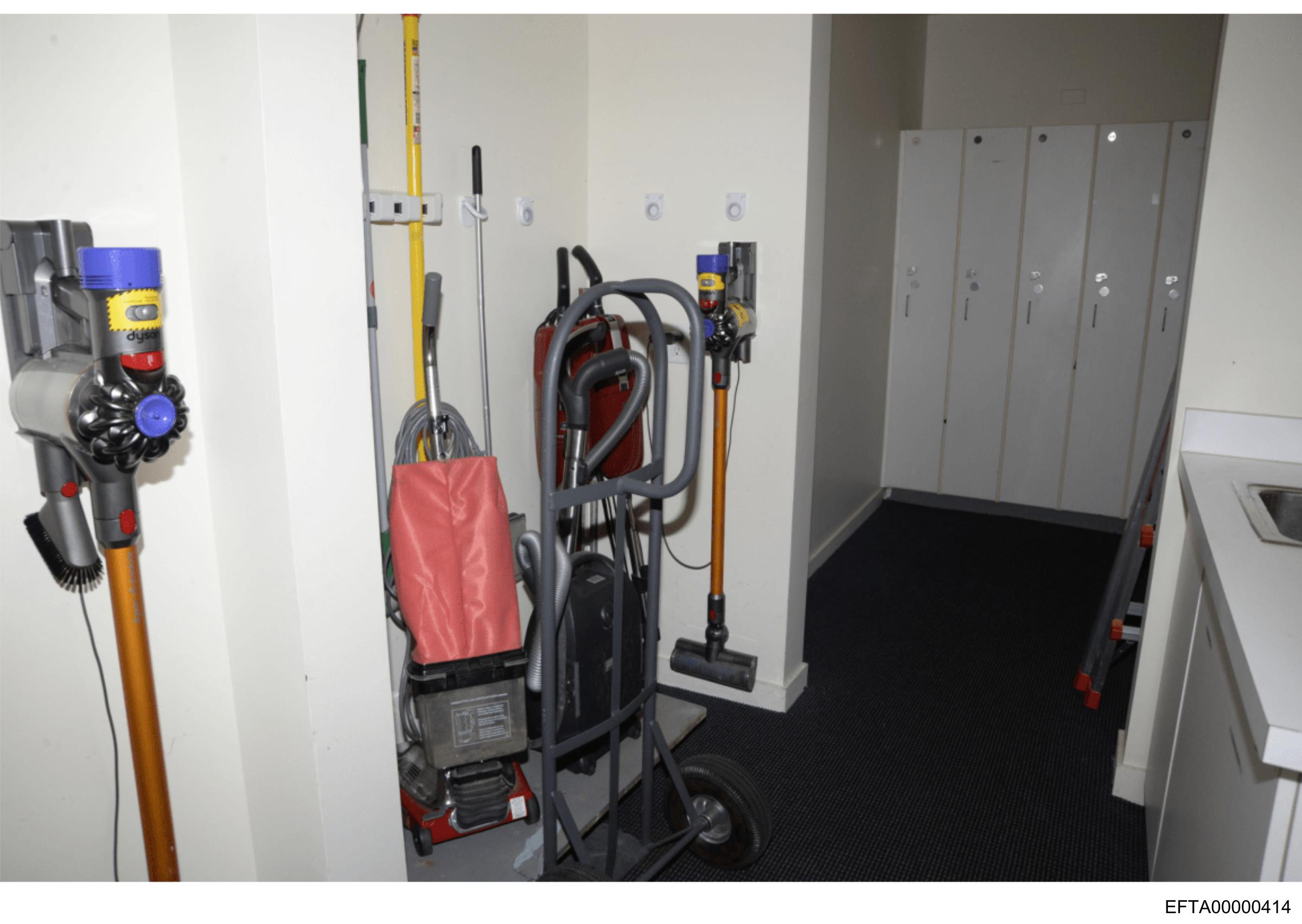 The image shows an indoor space that appears to be a storage area for cleaning equipment.