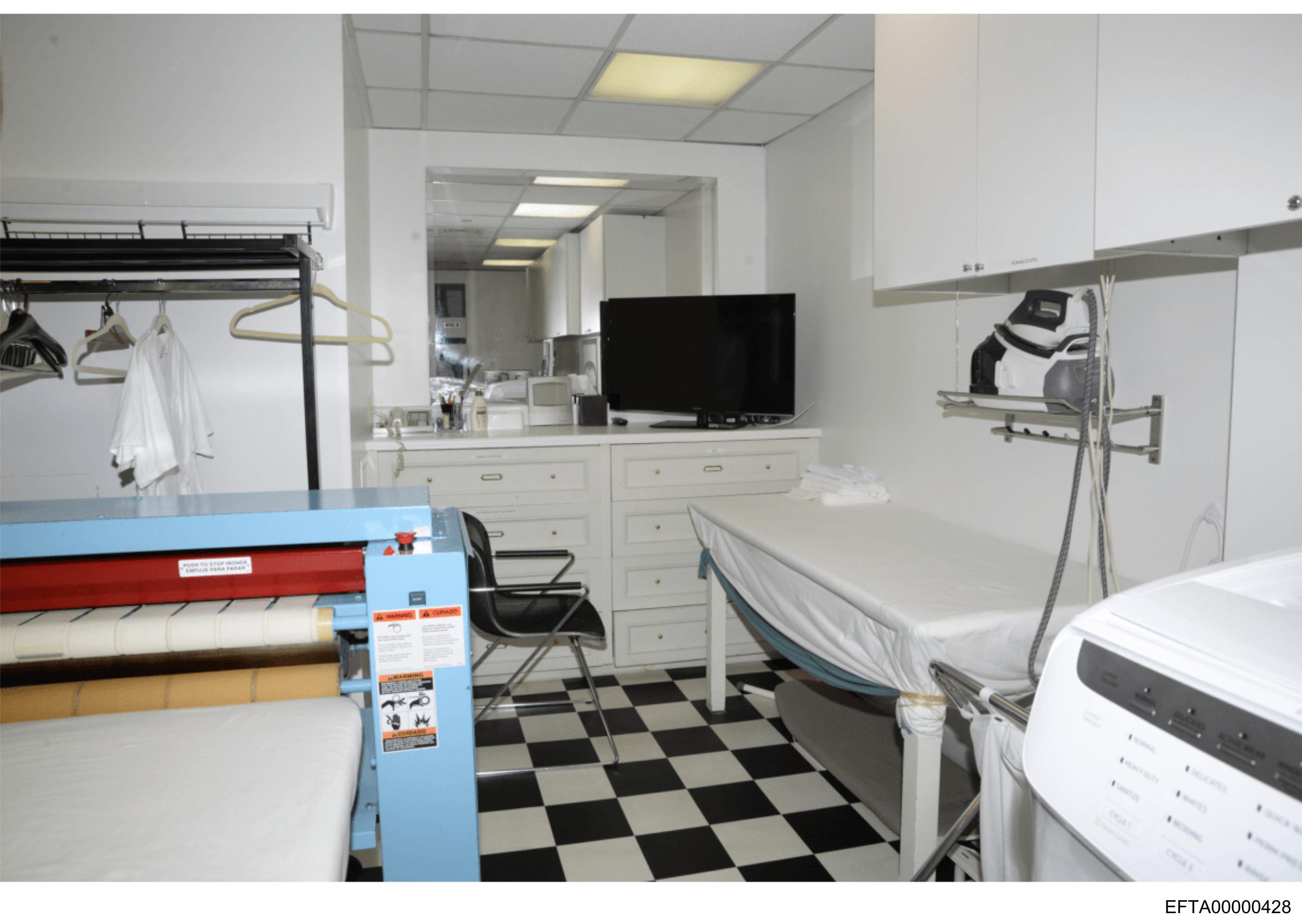 The image displays an interior room that appears to be a workshop or storage area. The dominant colors are white and blue, with white walls and a large piece of equipment in the center with a blue base. There is black vinyl flooring with a diamond pattern. A wooden cabinet stands against one wall. On the left side, there's a television mounted on the wall, and some clothing items hang from hooks above it. The room has artificial lighting, indicated by a light fixture visible on the ceiling.