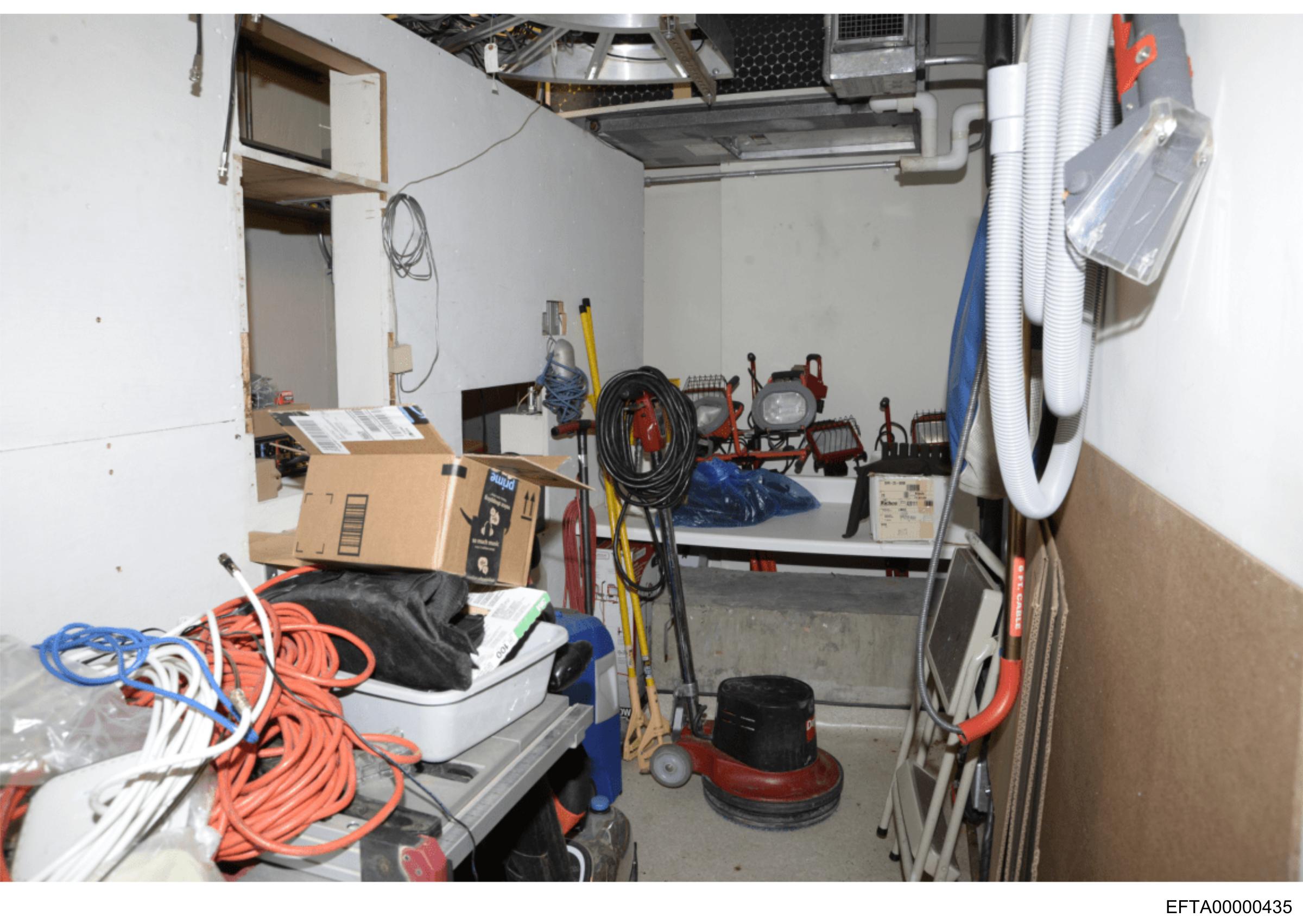 The image displays a cluttered room that appears to be filled with various pieces of equipment and supplies.