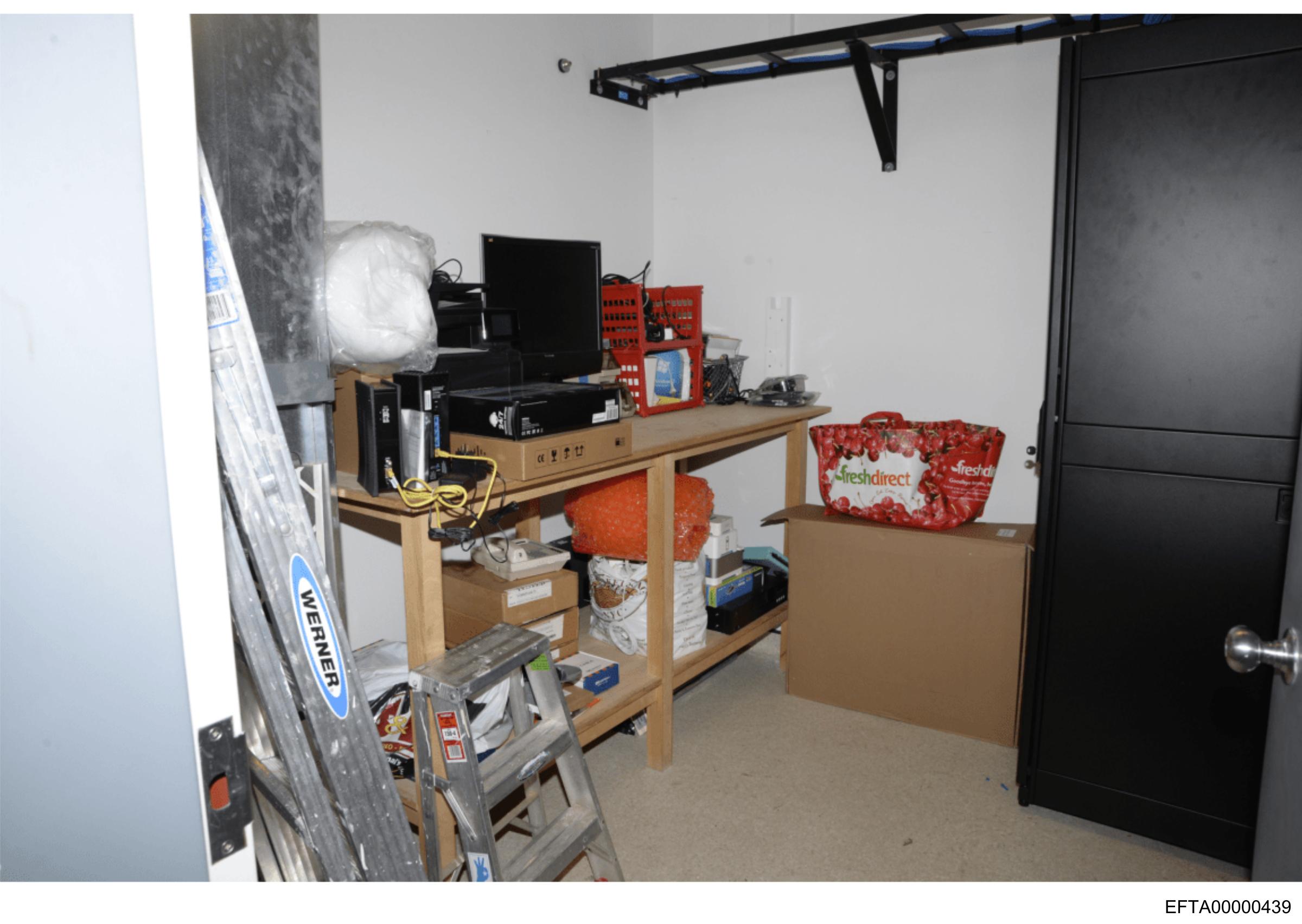 The image depicts a cluttered room with various items scattered around. In the foreground, there's a desk holding several objects including what appears to be a television or monitor, a laptop, and other miscellaneous items. On top of the desk are also a few bags and boxes that look as if they might contain food or snacks. To the right side of the image, there is a filing cabinet with drawers that are partially open. Behind the desk, there's a partial view of another room where a ladder leans against a wall. The overall atmosphere suggests this space is used for work or storage and it is in disarray.