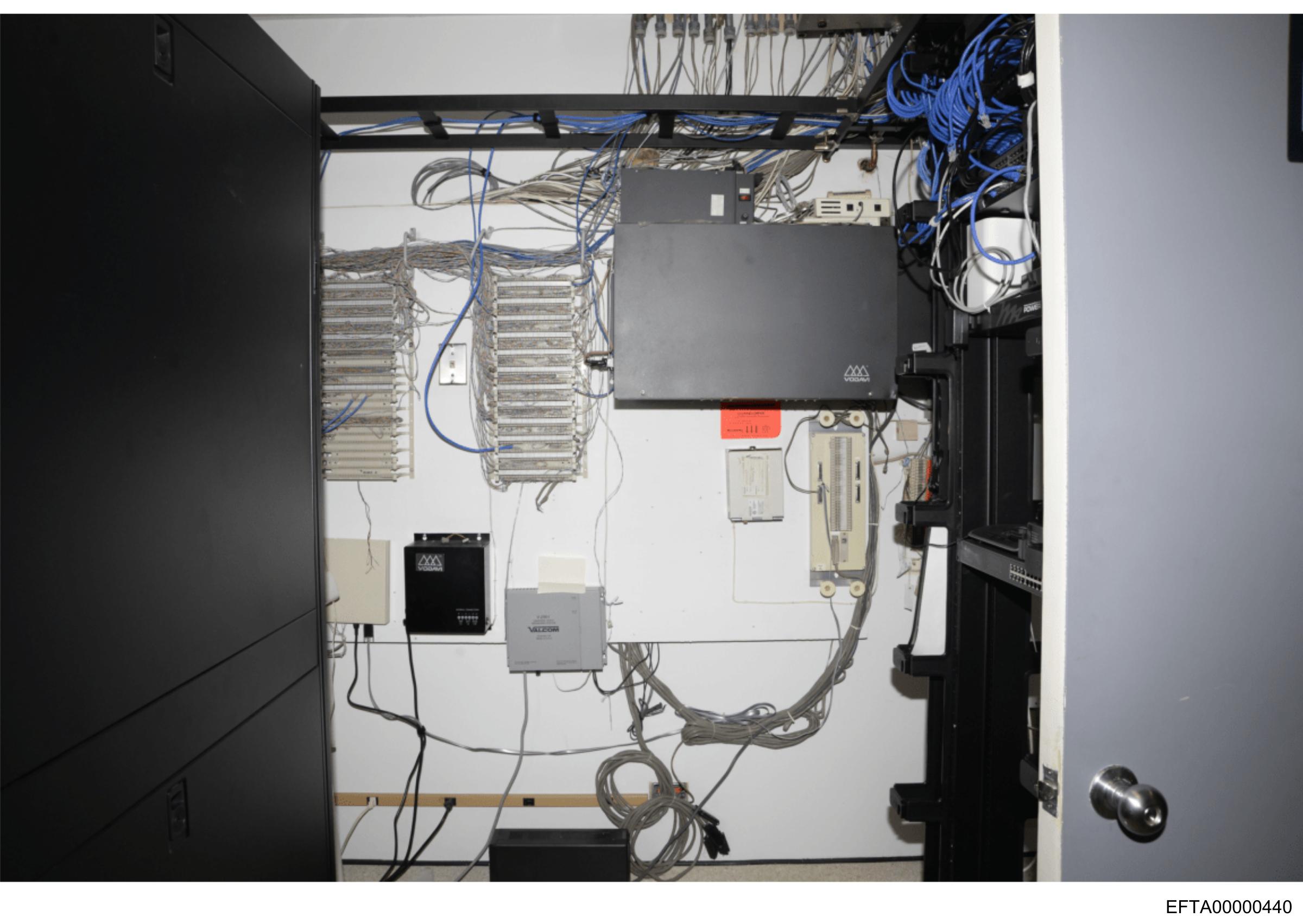 The image shows an interior view of a room that appears to be an electrical room or part of a data center due to the presence of numerous wires and cables. On the left side of the photo, there is a cabinet with what looks like electronic equipment, possibly servers, stacked on top of each other. The right side features exposed wiring and conduits running along the walls, leading down to various switches and outlets. There are no visible texts or people in the image. In the bottom right corner, there's a watermark that reads "ETX124" which might indicate the source or owner of the photograph.