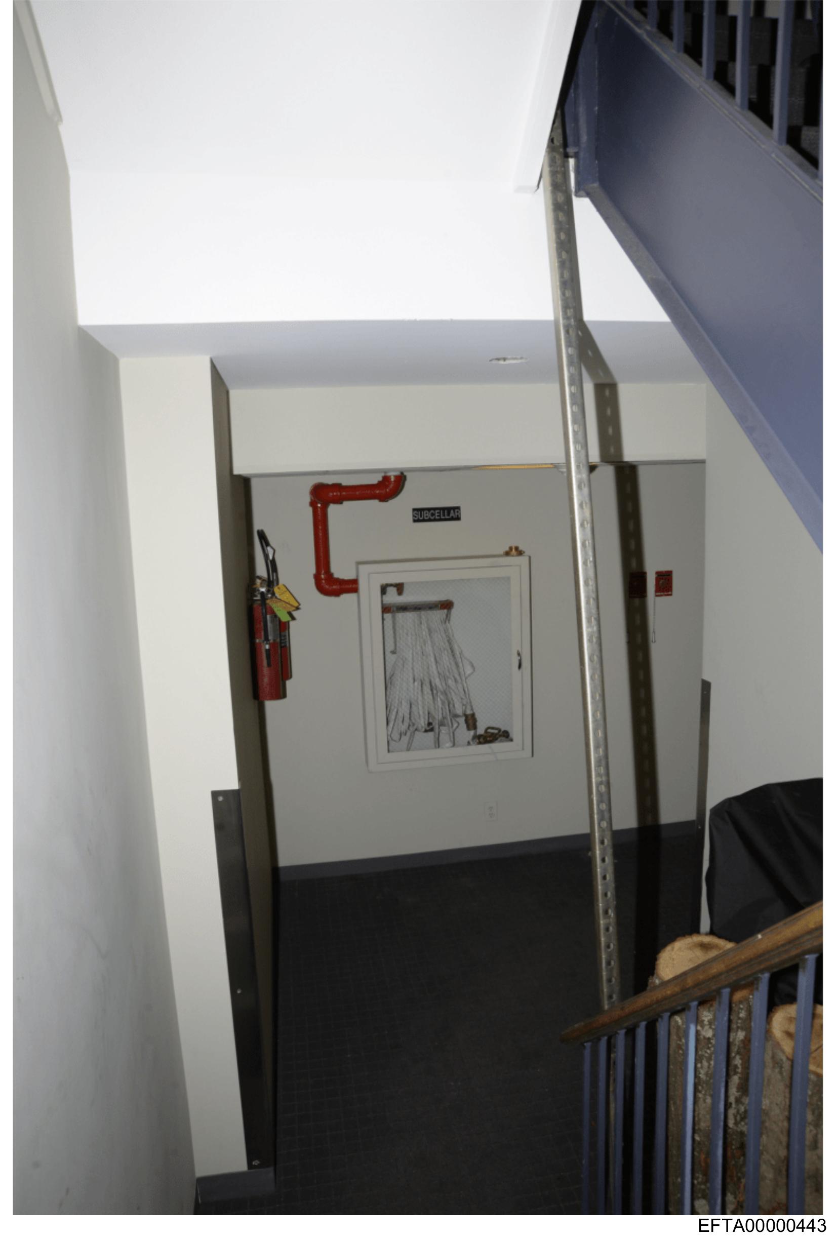 The image captures a moment in an industrial setting. Dominating the scene is a staircase with black railings, leading the eye upwards towards the unseen top. A fire extinguisher and a hose reel are mounted on the wall to the right of the stairs, symbols of safety measures in place. The floor beneath is adorned with tiles, while the walls rise above them, their details obscured by distance. The image is slightly tilted, adding an element of dynamism to the otherwise static scene. There's no text or people visible in this captured slice of life.