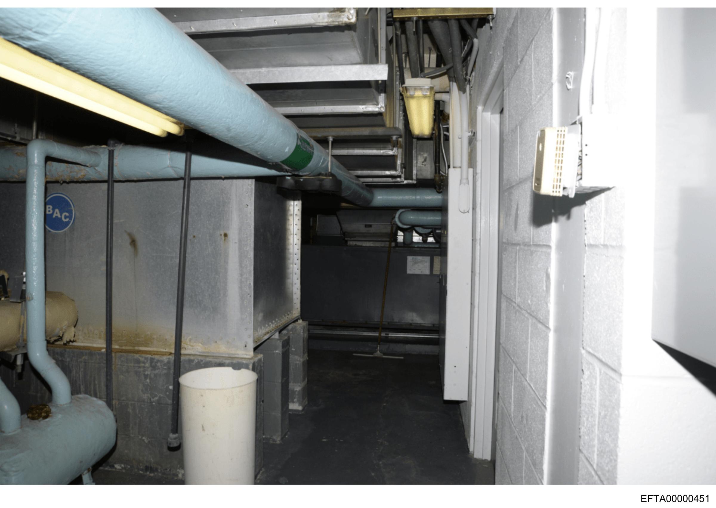 The image shows an interior space that appears to be a utility room or basement with industrial features.
