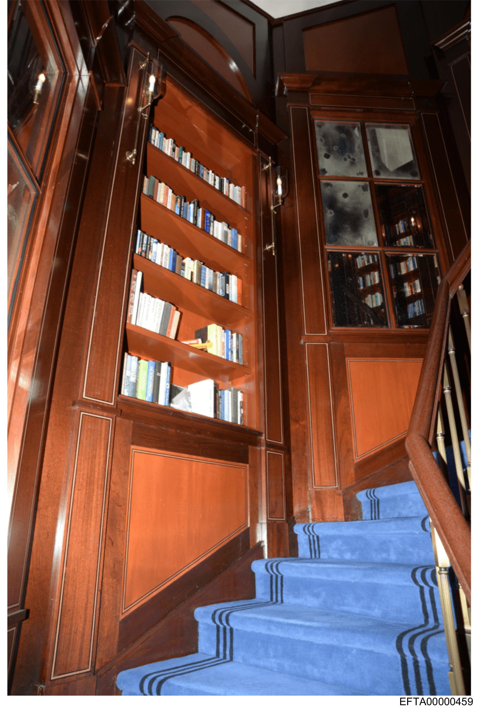 The image captures a grand staircase leading to an upper level, adorned with wood paneling that adds a touch of elegance. The steps, covered by blue carpet, invite one to ascend, while the bookshelves flanking the stairwell suggest a space for learning and intellectual pursuits. A single light fixture hanging from the ceiling casts a warm glow over the area, enhancing its inviting ambiance.
