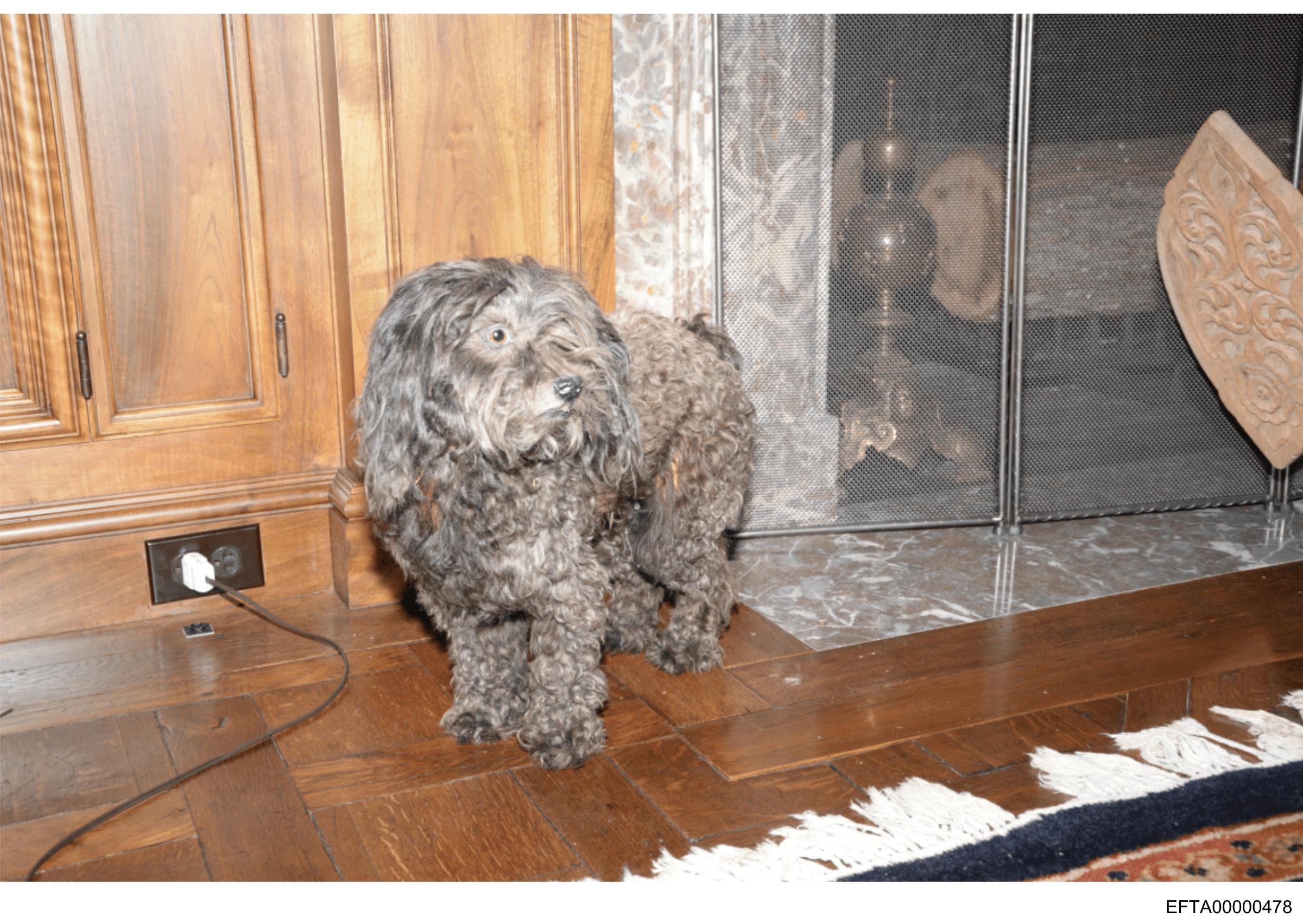 The image shows an indoor scene featuring a dog sitting on the floor.