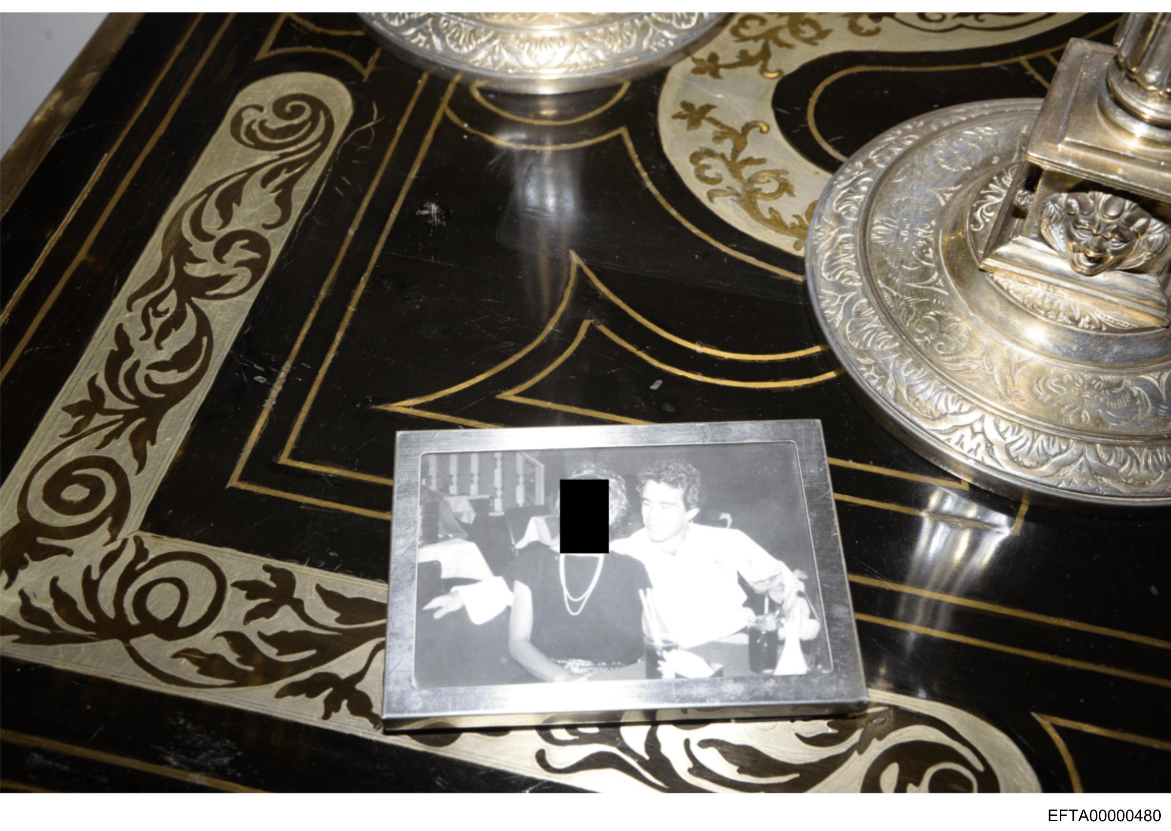 The image shows a vintage photograph of two individuals placed on an intricately carved wooden surface with gold accents. The photo is slightly angled to the right and appears to be in a worn state, suggesting it may be old or has been handled frequently. In the bottom left corner of the image, there's a black mark resembling a 'censored' symbol, possibly indicating that the content was considered sensitive or private at some point. The visible text is too small to read clearly but seems to be part of a watermark or signature in the upper left corner. The style and quality of the photograph hint at it being from an earlier period in photography.
