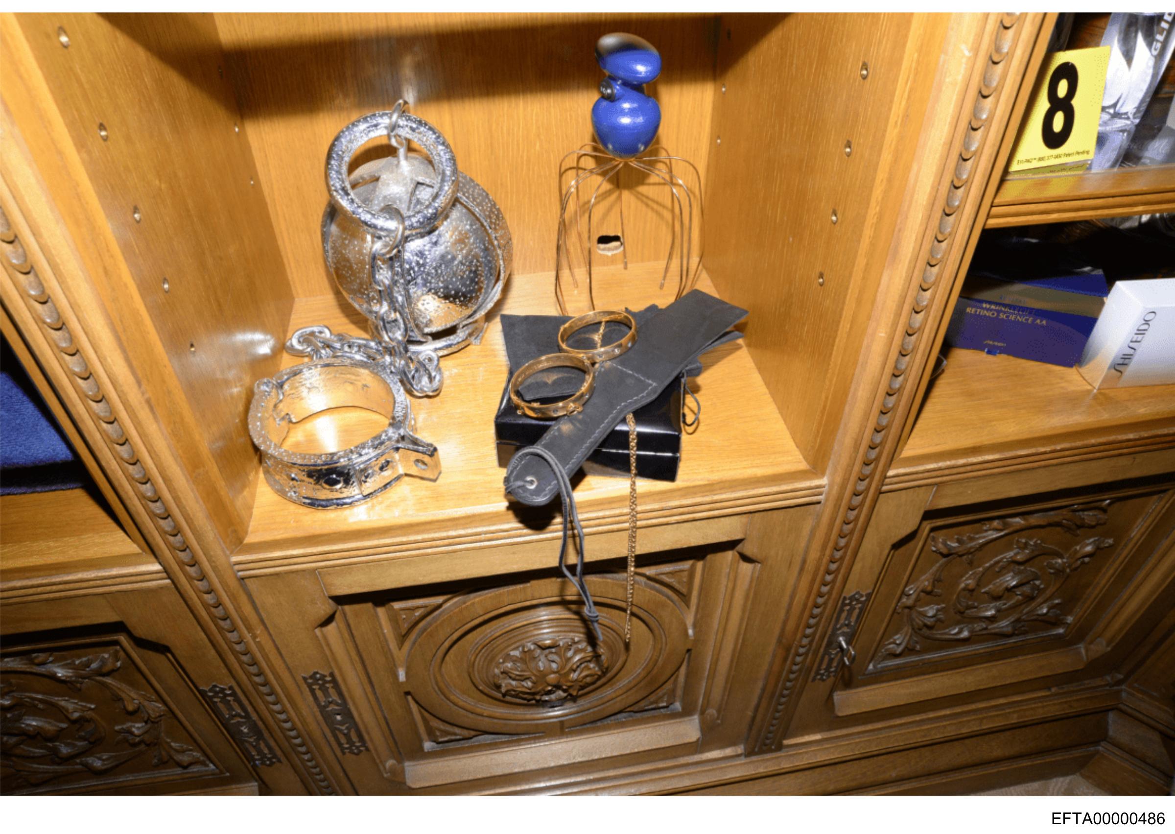 The image shows an interior view of a display cabinet with glass doors. On the shelves inside, there is a collection of various items, including what appears to be decorative figurines or porcelain figures in the top left corner and a small bowl at the bottom left. There are also some objects that resemble vases or containers with a metallic finish, placed centrally above another object that looks like a black tray or stand with handles. The cabinet has an elaborate wooden frame design, adding to its decorative nature. The photograph is taken from a slight angle, and there's visible text on the image in the lower left corner that reads "ETX023," which could be part of a cataloging system or a reference number for the displayed items.