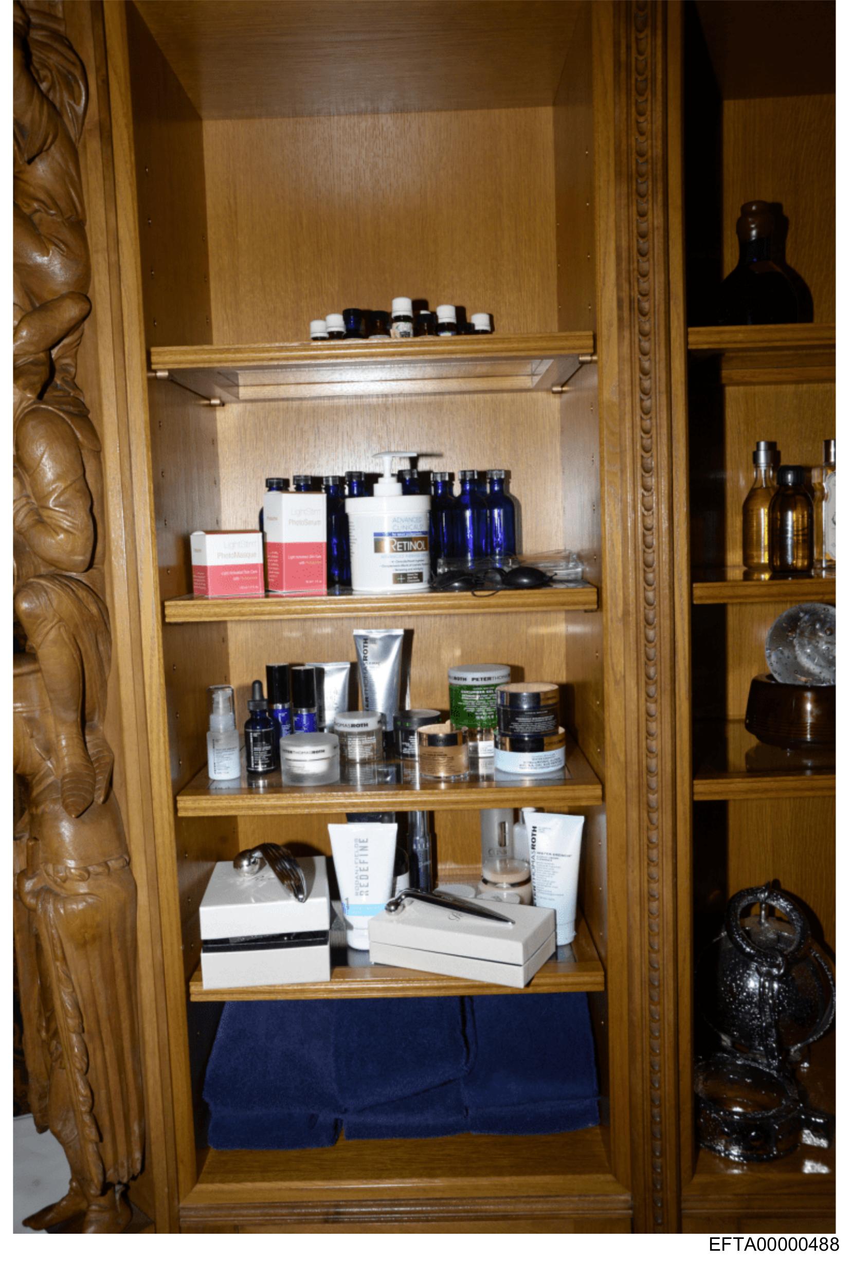 The image displays an open wooden cabinet filled with various products and items.